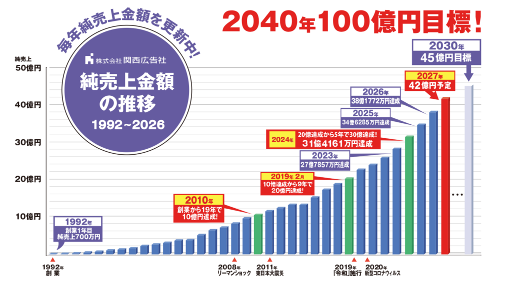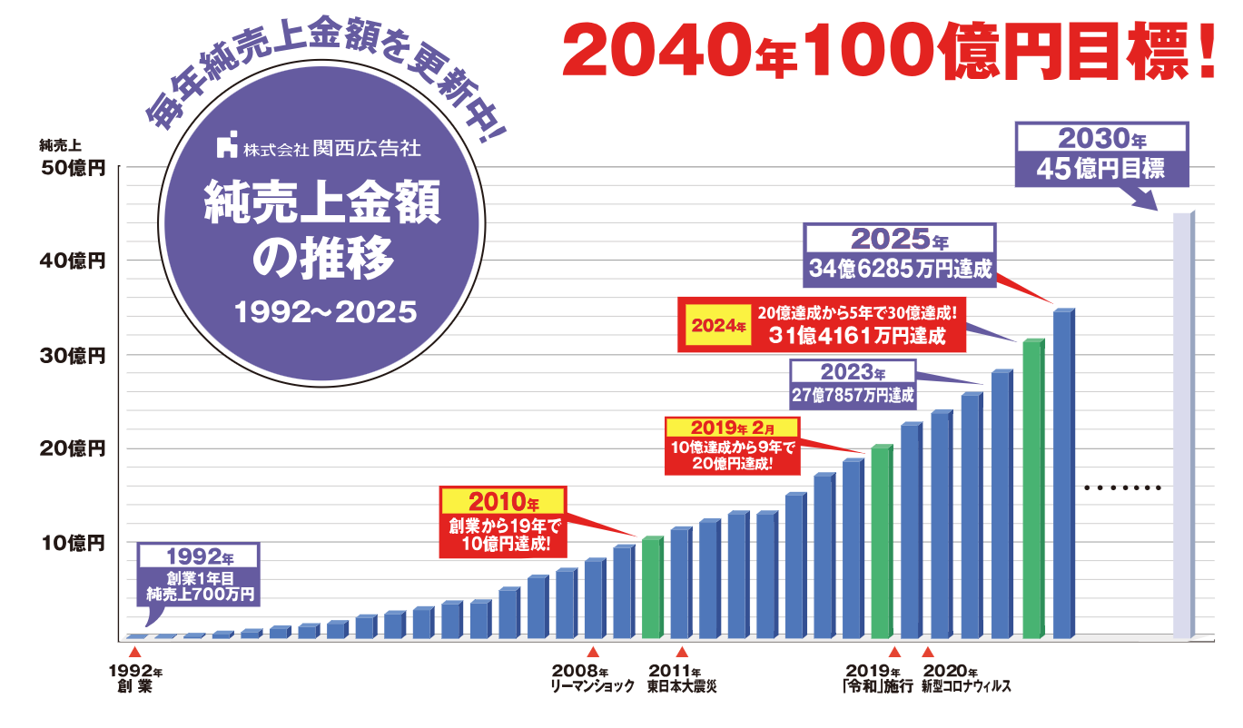 関西広告社は1992年の創立より34年間、災害や不況を乗り越え成長し続けています。